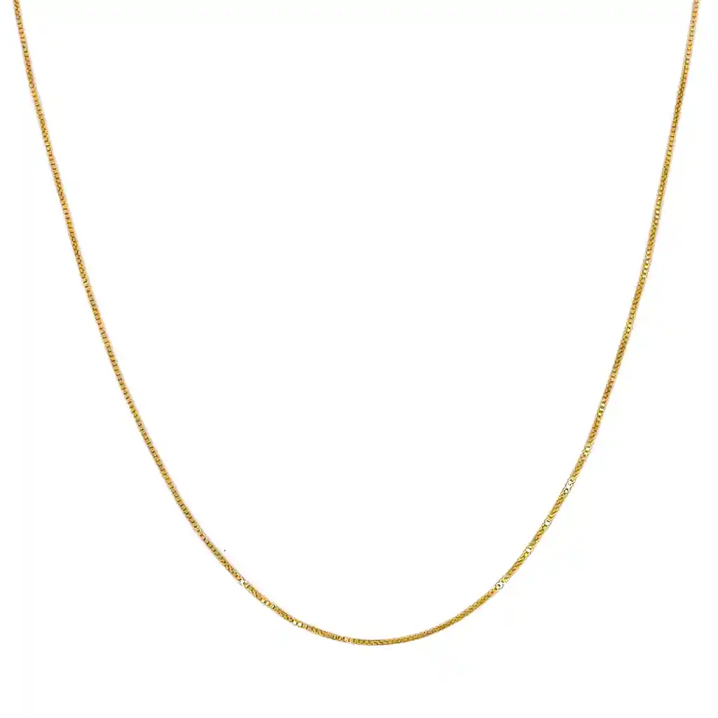 Hermosa y delicada cadena modelo Veneciana fina Enchapado en Oro 18K. Fabricado en Bronce y Enchapado en Oro 18K. La calidad del material es garantizada y no posee níquel. Medidas Largo de la cadena 45cm, grosor cadena 1mm. Peso de la cadena 1 gr.