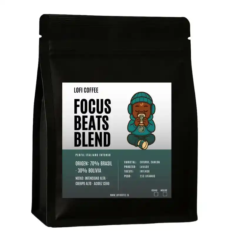 Café Focus Beats Blend – Perfil Italiano Intenso 70% Robusta (Conilón) – 30% Arábica | Origen Brasil & Bolivia | Tueste Intenso Focus Beats Blend es tu café si buscas un sabor intenso y más común en la taza. Perfil de sabor Intensidad alta. Este es un sabor común, el cuál encuentras en la mayoría de los café comerciales. Acidez cero Un café profundo, decidido y perfecto para quienes quieren energía y sabor fuerte. ¿Para quién es este café? Ideal para quienes: Les gusta el café intenso, oscuro y con carácter. Prefieren acidez nula. Necesitan un café que “despierte”. Toman café con leche y quieren que el sabor destaque Es un café directo, fuerte y sin complicaciones. Si quieres potencia, este es tu blend. ¿Cómo tomarlo? Puro (para fanáticos de la intensidad). Con leche o bebidas vegetales: queda muy cremoso y mantiene sabor. En la mañana para despertar o en la tarde como café energético. Excelente para preparaciones tipo latte, capuccino o moka