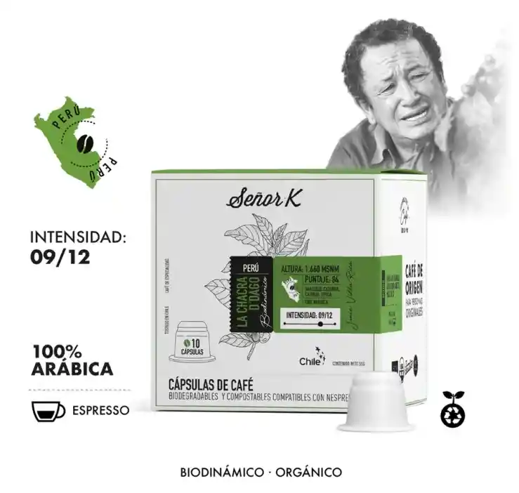 Café de especialidad en cápsulas compostables, proveniente de Villa Rica Perú, de tueste medio, lavado, con notas de chocolate, chancaca, azúcar rubia, nueces, malta dulce. Origen: Villa rica Finca: La Chacra D´ Dago Variedad: Caturra, typica, catuai ACIDEZ:●●●○○ CUERPO:●●●●● DULZOR:●●●●○ BALANCE:●●●●○ Capsulas compostables compatibles con NESSPRESO®