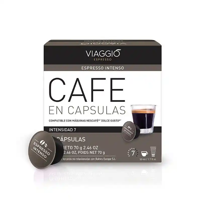 10 Cápsulas Café Viaggio Espresso Intenso para Dolce Gusto Contenido: 10 cápsulas | 10 Tazas | 1 Caja | Variedad Intenso | Intensidad: 7 | Cada café utiliza una sola cápsula. Para todos los apasionados por los sabores intensos, las cápsulas de café Viaggio Espresso compatibles con Dolce Gusto Sabor Espresso Intenso brinda un sabor balanceado y envolvente, matizado con la acidez justa que le da un balance único. Su tueste medio y el aroma a nueces le brindan un toque especial a cada taza. Disfruta este blend en tus cafeteras Dolce Gusto. Disfrútalo al máximo: Para disfrutarlo de la mejor manera, introduzca la cápsula Viaggio Espresso Espresso Intenso en la cafetera Dolce Gusto y sitúe el dosificador en el nivel 2 (50 ml) y con la opción bebidas calientes. De esta manera podrás disfrutar de este café con la intensidad que lo caracteriza. Cápsulas compatibles con las cafeteras Dolce Gusto. Elaborado en España.