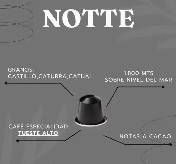 NOTTE GRANOS: Castillo, Caturra, Catuai 1.800 mts sobre nivel del mar CAFÉ DE ESPECIALIDAD Tueste alto NOTAS: Cacao CÁPSULAS COMPATIBLES CON NESPRESSO® ☕