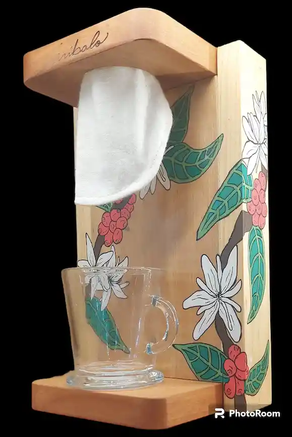 Cafetera artesanal de madera nativa (Raulí, Sequoia). Pintada a mano con las flores del café. Portátil y plegable para llevar donde quieras. Incluye filtro reutilizable