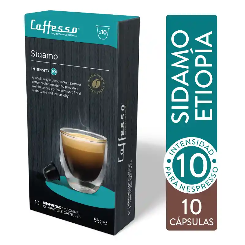 Una mezcla de café premium de la región de Sidamo en Etiopía. Granos de café tipo Arábica con suaves notas florales. Contiene 10 cápsulas. packing: Caja