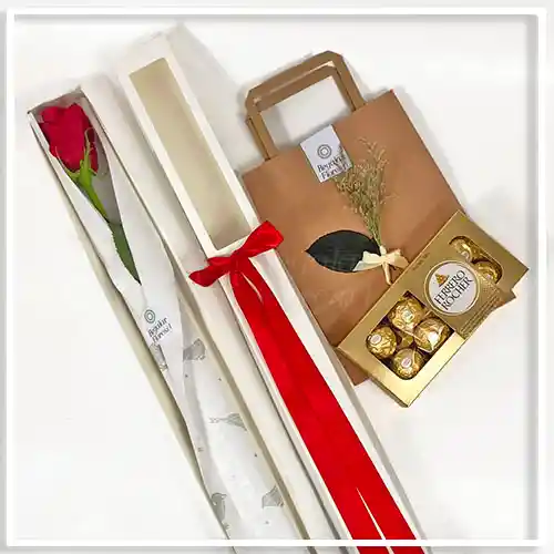 Clasica caja con 1 rosa ecuatoria + Chocolate Ferrero Rocher 100gr. Cada rosa va inserta en aquapick (bombilla con agua) para una mejor hidratación.
