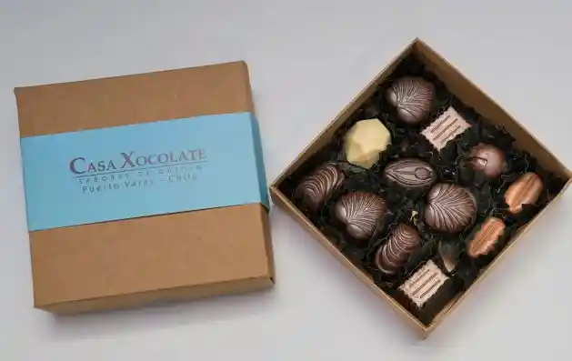 12 deliciosos bombones finos artesanales, mix sabores como avellana, café, maracuyá, menta. En caja Kraft ecológica. Ideal para disfrutar o regalar todo el sabor del Sur.