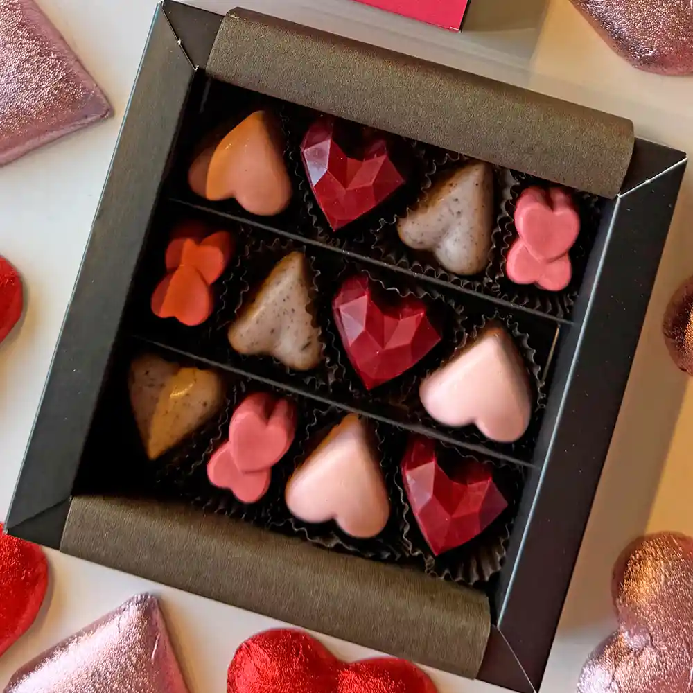 12 bombones en forma de corazón rellenos. Variedades Bitter con mantequilla de maní y caramelo, leche con gelée de frambuesa y chocolate blanco, blanco con té de hibisco, leche con dulce de leche, leche con Maracuyá y leche con pistacho.