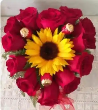 Caja 12 Rosas + 1 Girasol + 3 Bombones