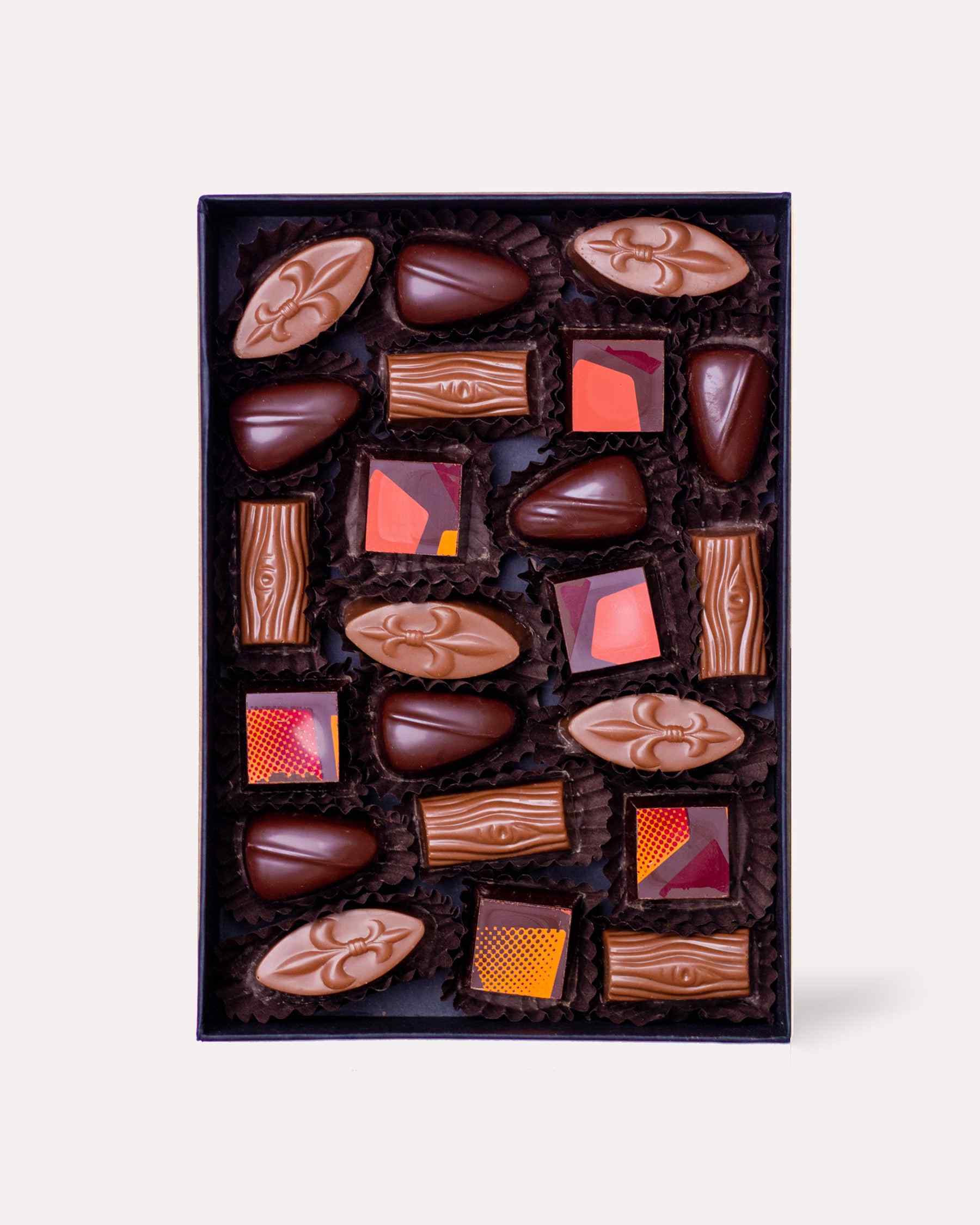 Finalmente en Le Vice Chocolat logramos desarrollar una caja de bombones que están IGUAL de ricos que los tradicionales. Misma cremosidad, misma intensidad, pero sin azúcar. La caja de 22 bombones sin azúcar contiene 4 sabores:Ganache de chocolate leche.Ganache de chocolate negro y leche infusionado en naranja.Ganache de chocolate leche y praliné de avellanas tostadas.Ganache de chocolate blanco y maracuyá.