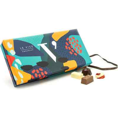 ¡Llegó el nuevo formato de 25 bombones para quedarse! El mix perfecto de Le Vice ahora en nuevo formato surtido de bombones. Manufacturados artesanalmente en Santiago de Chile con chocolate importado de Francia y Bélgica. Te aseguramos que nuestra selección más fina de bombones artesanales te sorprenderá a ti y a tus cercanos. Sólo usamos ingredientes frescos sin aditivos ni preservantes y todos nuestros productos son 100% artesanales. Incluye un surtido de bombones rellenos en praliné (pasta de avellanas, almendras, pistachos y/o maní), ganaches, caramelos y mazapán.