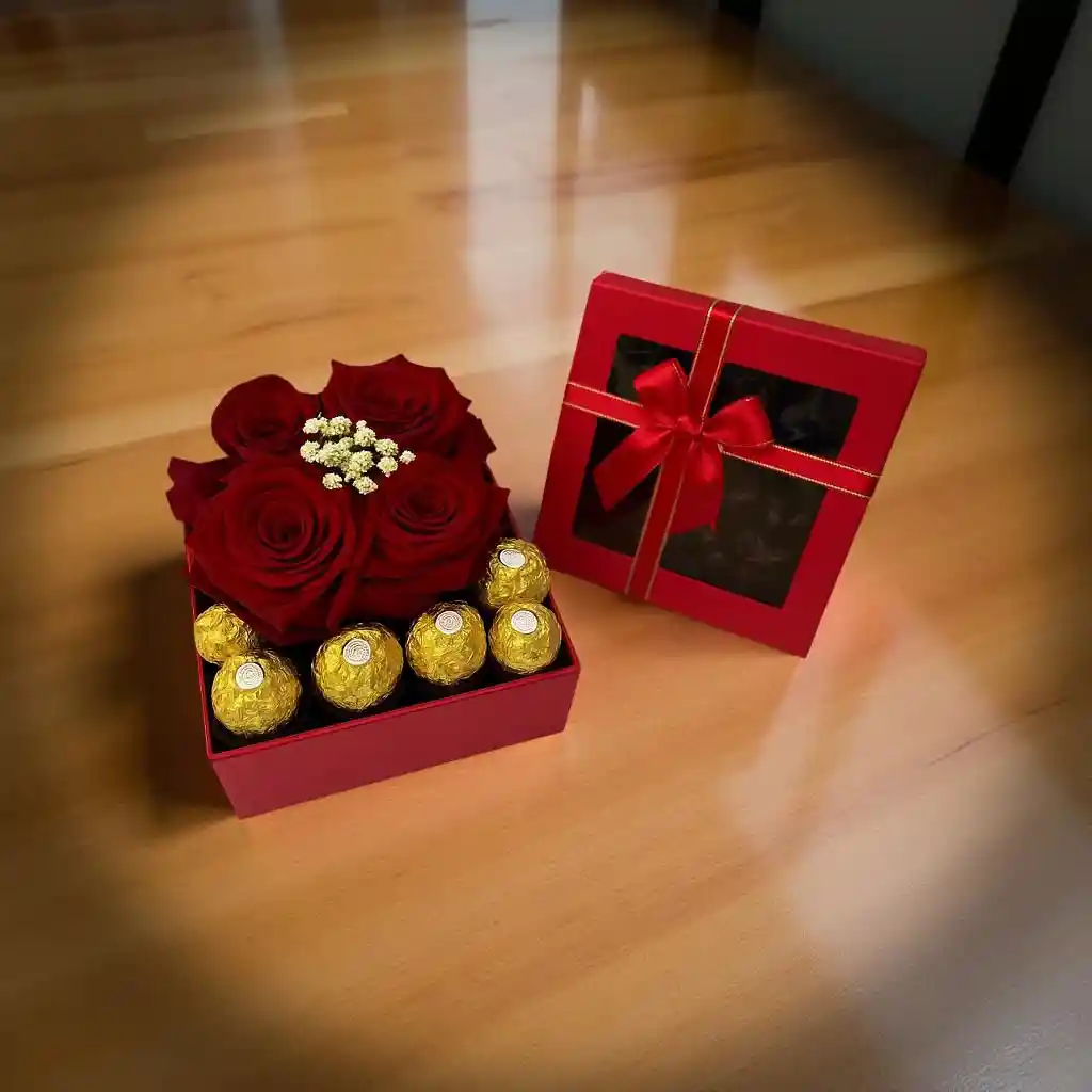 HERMOSA CAJA 4 ROSAS Y 12 CHOCOLATES PARA REGALAR EN CUALQUIER OCASIÓN