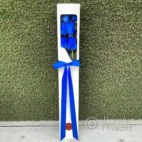 Hermosa Caja de 6 Rosas azules ecuatorianas envueltas en papel arroz y lazo de cinta, la caja va cerrada con rosetón de cinta de raso. Cada rosa va inserta en aquapick (bombilla con agua) para una mejor hidratación.