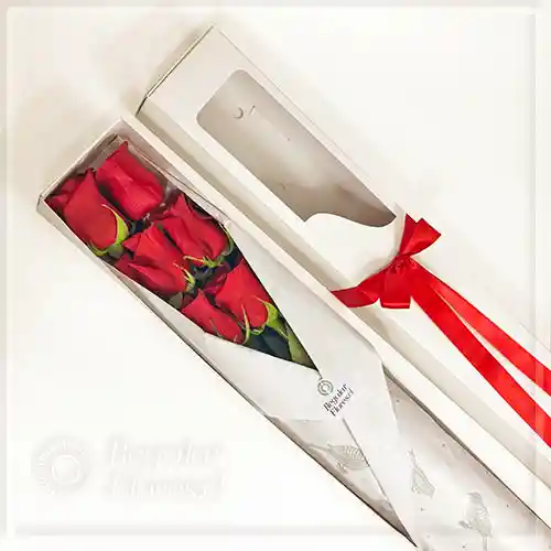 Caja con 6 hermosas rosas ecuatorianas envueltas en papel arroz y lazo de cinta