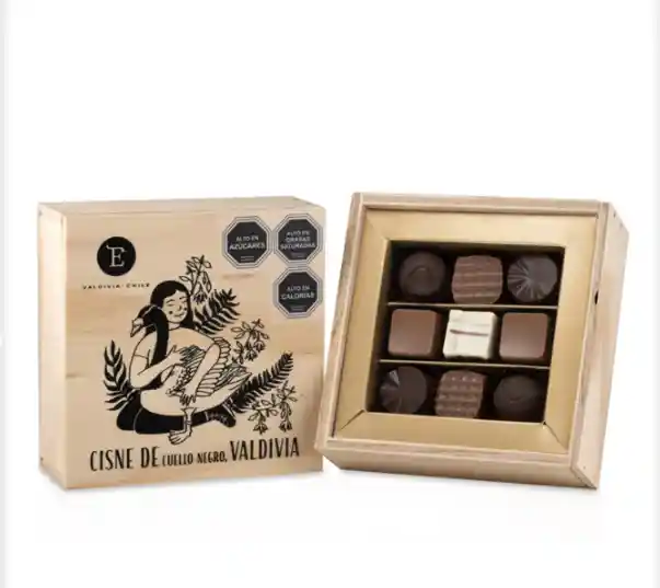 Caja de madera con una exquisita selección de bombones con los sabores tradicionales de Entrelagos, 9 unidades.