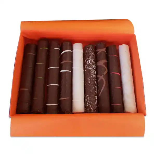 Caja Con 9 Unidades de Barquillos Rellenos Surtidos, variedades entre pistacho, naranja, lúcuma, chocolate, coco, entre otros.