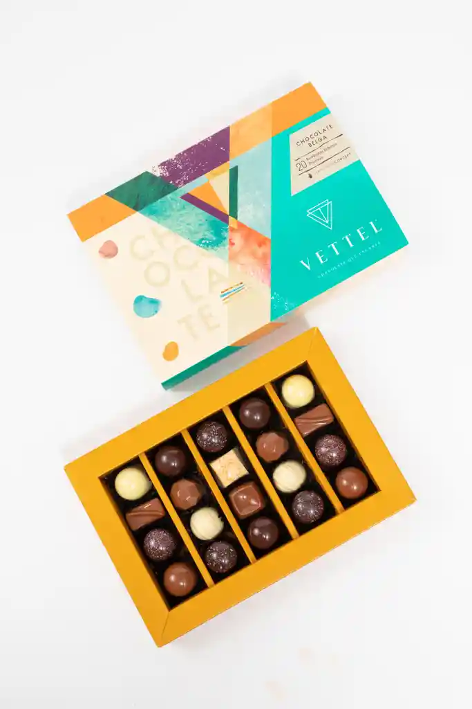 En Vettel decidimos trasladar la experiencia del Chocolate Belga de la mano de nuestro Maestro Chocolatero para crear estas 20 piezas tan diversas de bombones de formas, rellenos y sabores para que puedas disfrutar esta exquisita tradición belga. Dentro de estos exquisitos sabores encontramos: - Chocolate Blanco 28% Cacao con Limón - Chocolate Blanco 28% Cacao con Maracuyá - Chocolate Blanco 28% Cacao con Caramelo - Chocolate Leche 35% Cacao con Praliné de Almendras - Chocolate Leche 35% Cacao con Praliné de Nuez - Chocolate Leche 35% Cacao con Gianduja de Avellanas y Sal de Cahuil - Chocolate Leche 35% Cacao con Ganache de Pistacho - Chocolate Bitter 55% Cacao con Ganache Frambuesa Menta - Chocolate Bitter 55% Cacao con Ganache Naranja y Cointreau - Chocolate Bitter 55% Cacao con Toffee y Ron