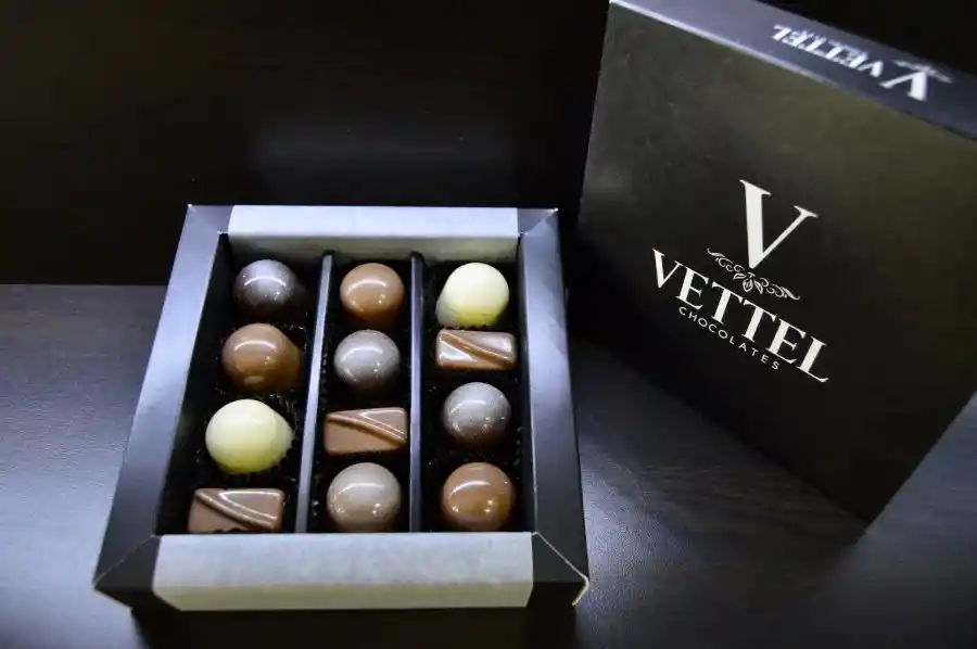 Blanco 28% cacao relleno con Maracuyá, Leche 35% cacao relleno con Gianduja y Sal de Cahui, Leche 35% cacao relleno con Praliné de Almendra y Coco, Leche 35% cacao relleno de Ganache de Café y Bealys, Bitter 55% cacao relleno con Ganache de Naranja y Cointreau,Bitter 55% cacao relleno con Toffee y Ron.