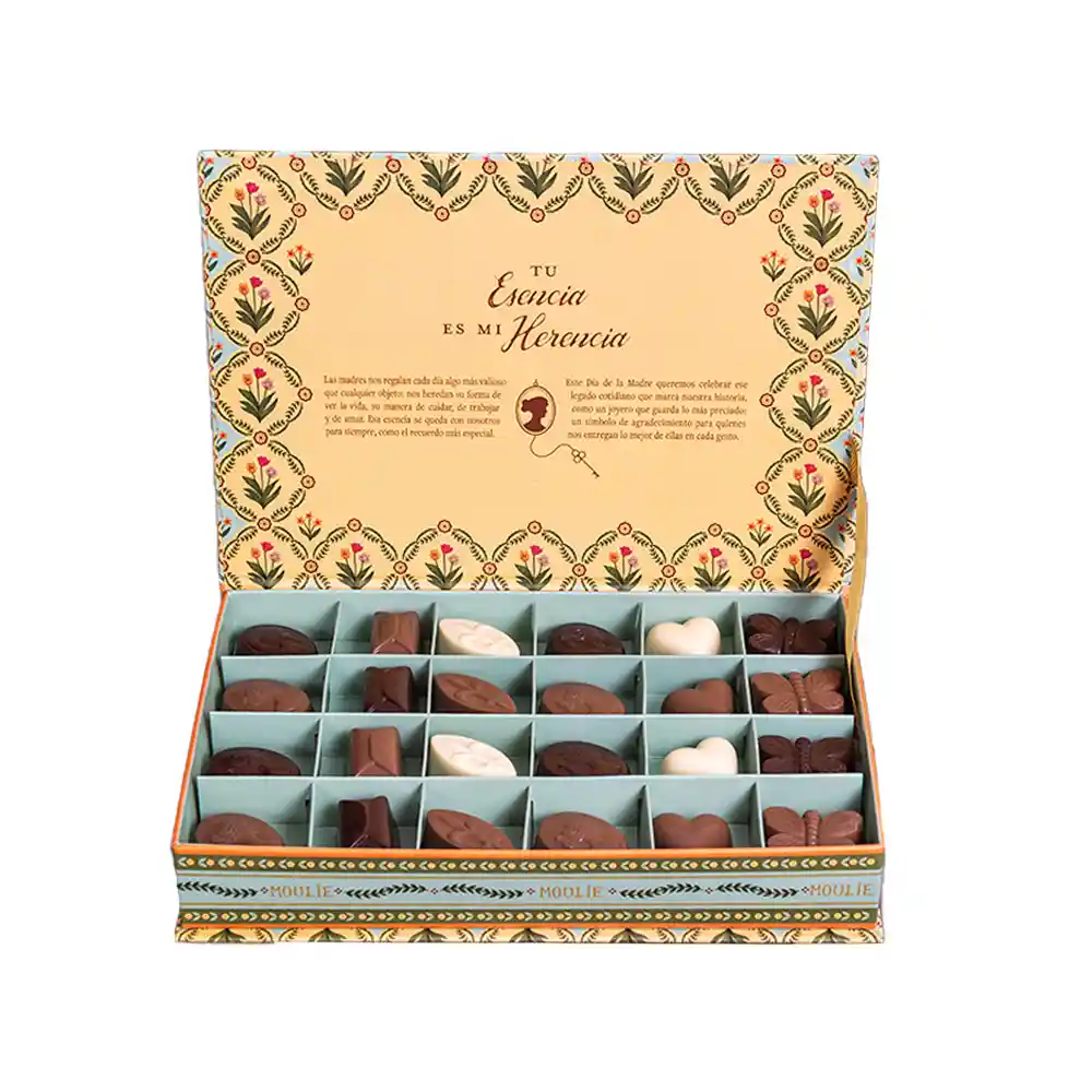 Caja de 24 bombones surtidos con diferentes rellenos. Contiene 300 grs.