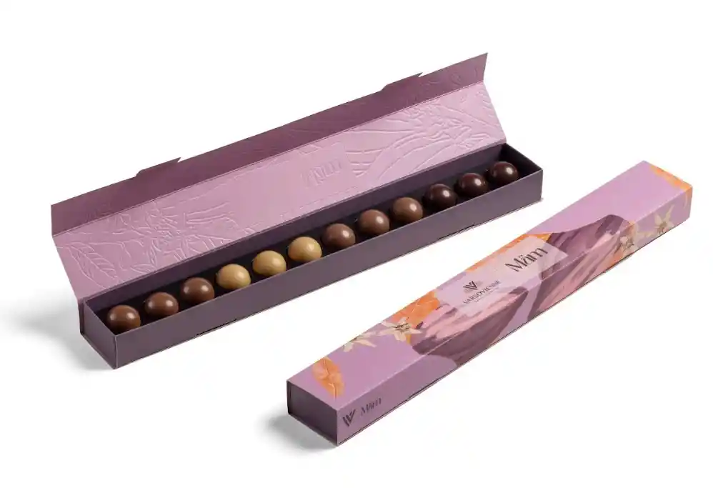 Caja temática con una variedad de Bombones de Chocolate de Leche relleno de Maní crocante, Chocolate de Leche relleno de Naranja crispy, Chocolate Rubio relleno de Ganaché de Café y Chocolate Bitter con nuestro nuevo relleno de Maracuyá.