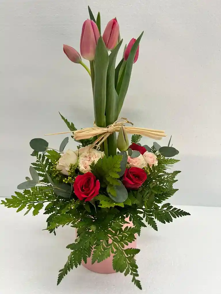 Caja bouquet 5 tulipanes y 8 Rosas surtidas