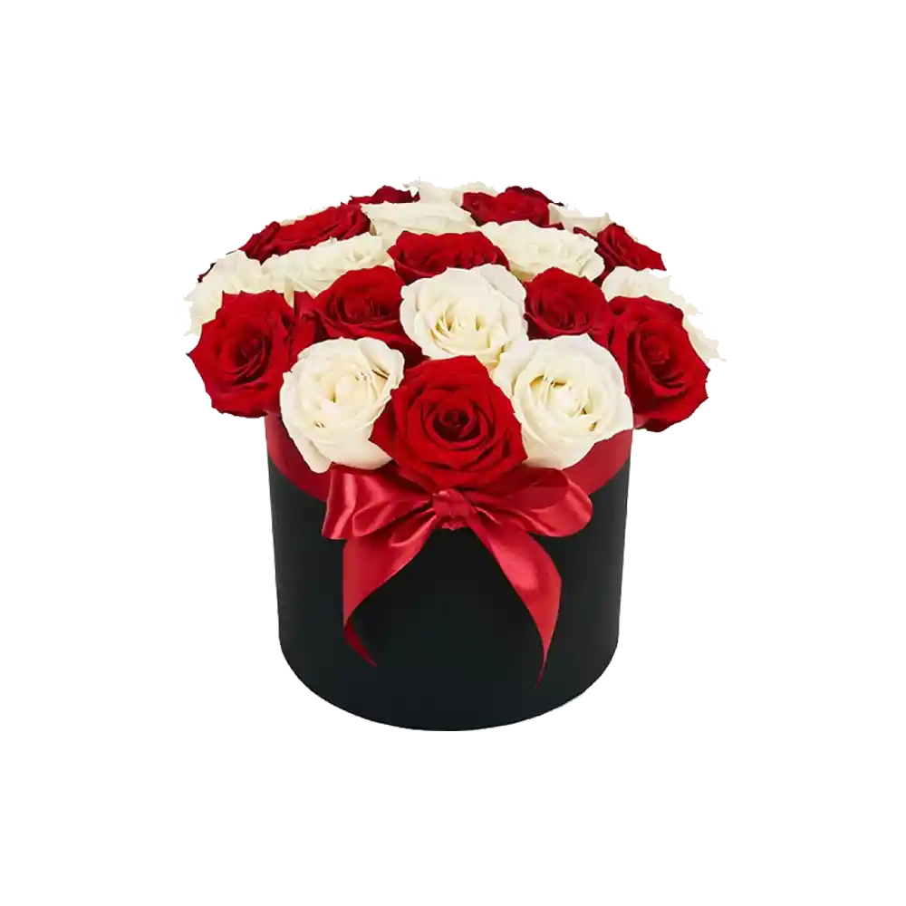 Hermosa caja cilíndrica con 18 rosas importadas en color rojo y blanco.