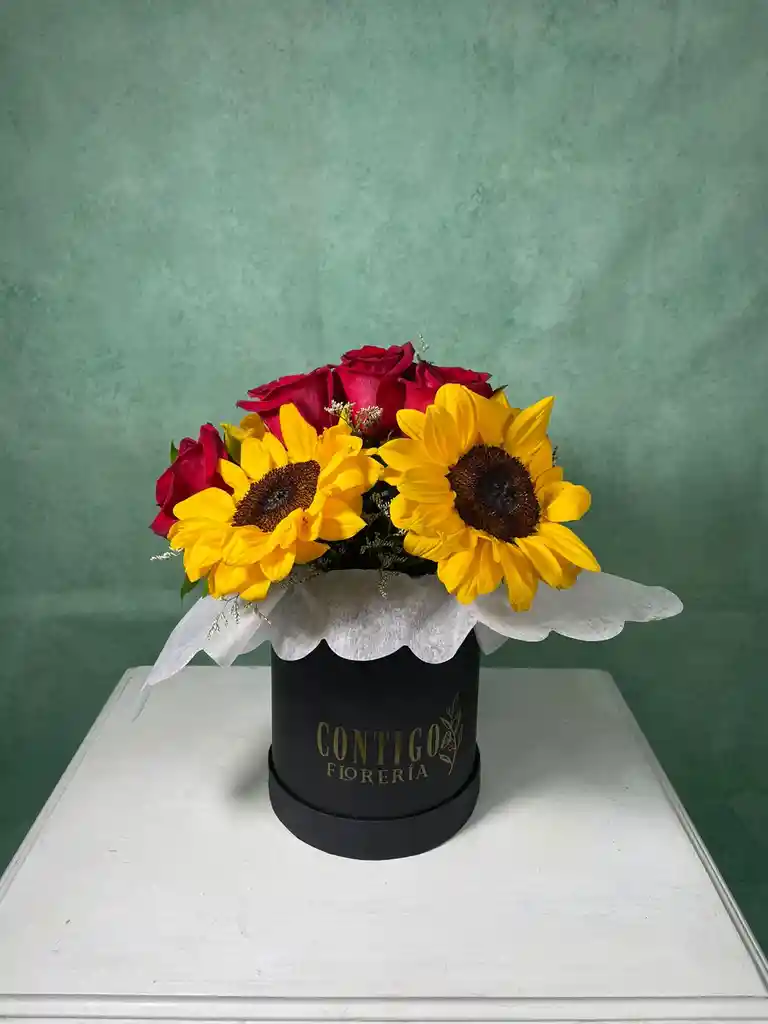 Arreglo de 4 Girasoles y 5 Rosas Rojas acompañada con Limoniúm y Ruscus