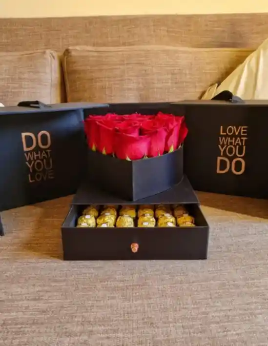 Caja negra de cartón y tela, con frase dorada, además de 15 rosas en plataforma de forma de corazón y en su cofre de 36 bombones ferrero rocher.
