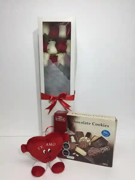 Contiene 3 Unidades: Caja Con 12 Rosas 1 Und + Lambertz Galletas de Chocolate 500 g + Peluche Corazón 19 cm 1 Und