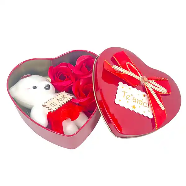 Caja de Regalo San Valentín en forma de corazón. Incluye un peluche de osito y rosas. Mide 12cm (ancho) 11cm (largo) y 4cm (profundidad).