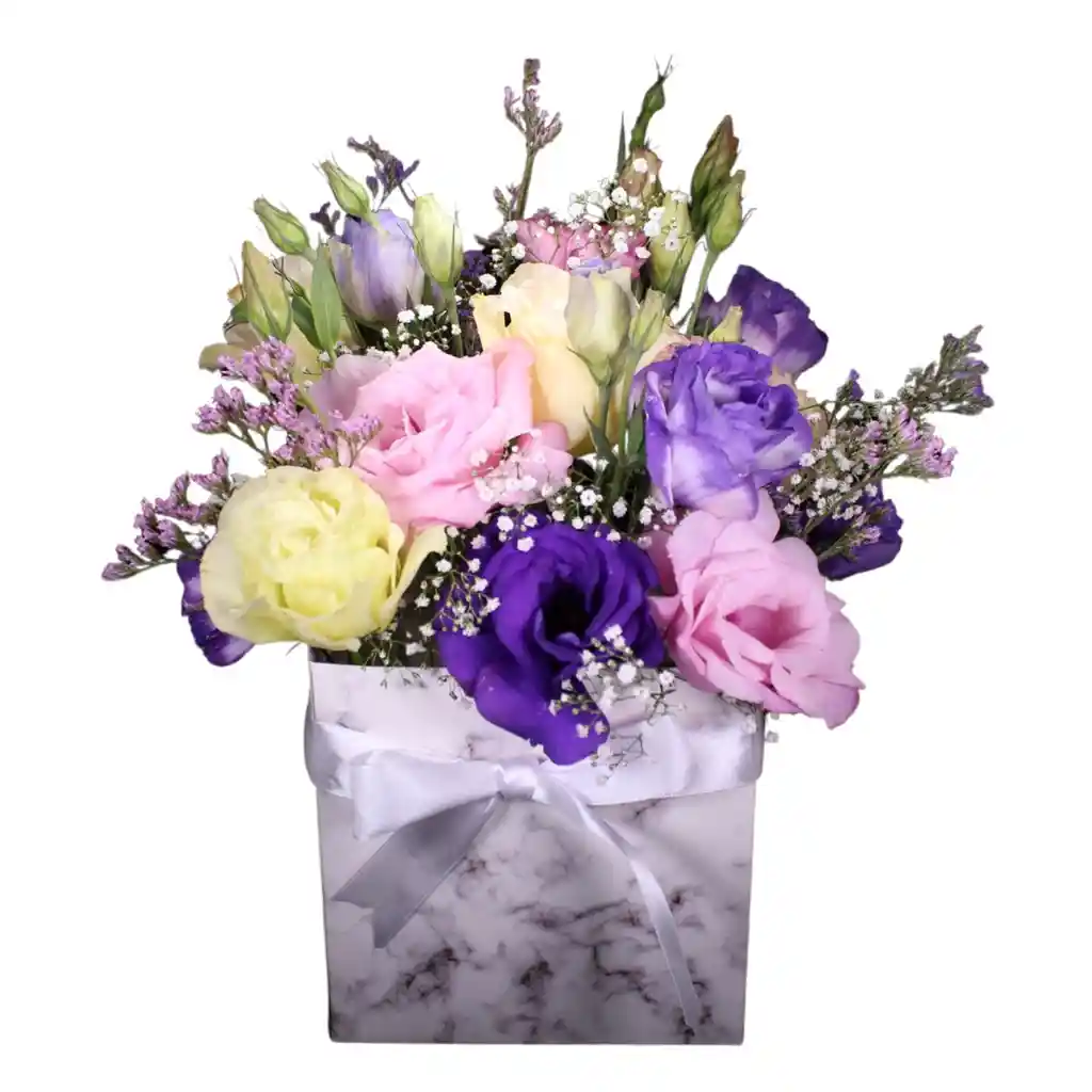 Arreglo de Lisianthus surtidos en caja diseño mármol blanco con follaje.