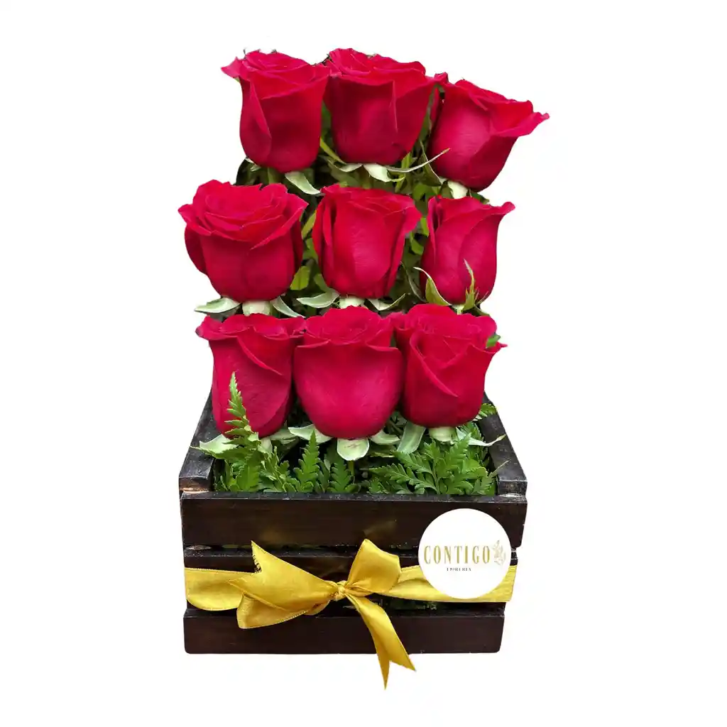 Arreglo en una hermosa caja de madera con 9 rosas rojas acompañadas de Limoniúm y Ruscus