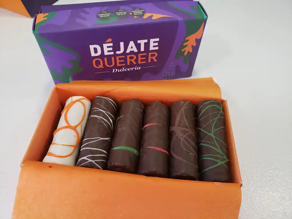 Caja contiene 12 unds de mini barquillos (6 cm aprox) totalmente cubiertos con chocolate por fuera y rellenos con distintos sabores, entre ellos, pistacho, coco, lúcuma, maní, entre otros.