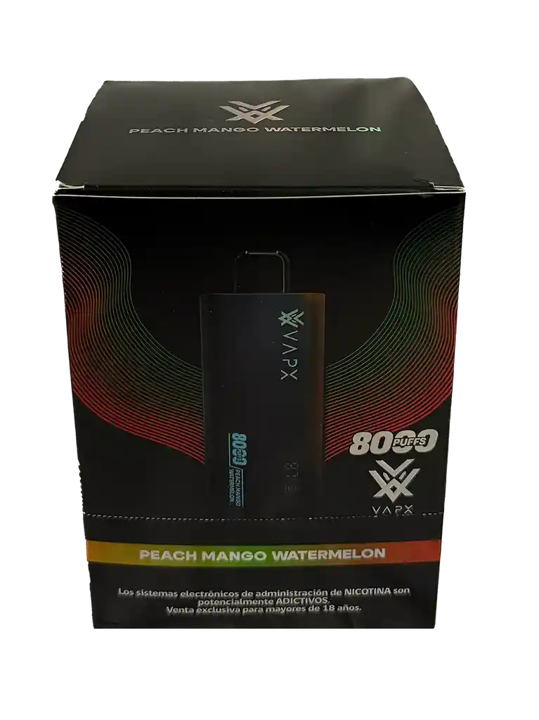 El VAPX 8000 PUFF Peach Mango Watermelon reúne durazno, mango y sandía en una mezcla jugosa y balanceada, con un perfil tropical bien definido. Cuenta con pantalla con indicador de líquido y batería, regulador de entrada de aire, es recargable con cargador Tipo C e incluye un lanyard de regalo.