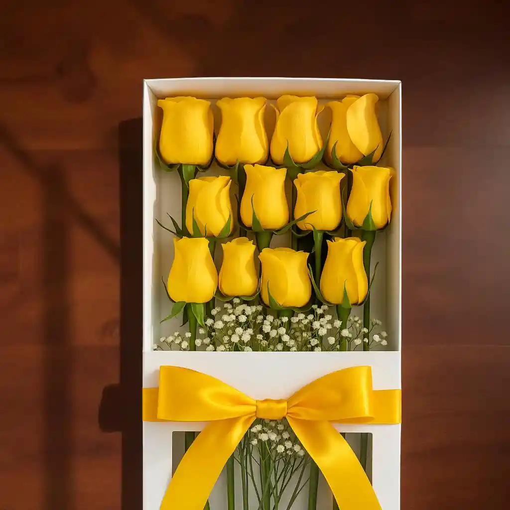 HERMOSA CAJA DE 12 ROSAS AMARILLAS PARA REGALAR EN CUALQUIER OCASIÓN