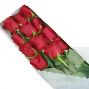 Caja blanca alargada conformada por 12 rosas rojas ecuatorianas adornadas con lazo de cinta satin