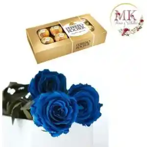 Caja de 3 Rosas Azules y Bombones Ferrero Rocher 100grs