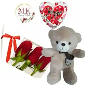Caja de 3 Rosas, Peluche 30cm y Globo