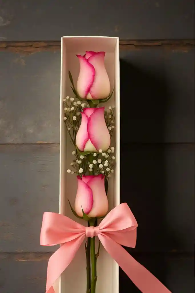 HERMOSA CAJA DE 3 ROSAS ROSADAS PARA REGALAR EN CUALQUIER OCASIÓN