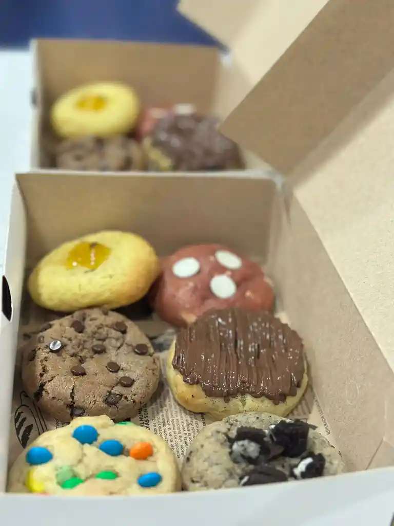 Galletas de suave textura, rellena y con toppings al estilo New York Cookies, 50 a 55 gramos Aprox. Cada Una Caja con 6 galletas surtidas: Oreo Crush Red Velvet Limón Maracuyá Nutella Lovers Doble chocolate M&M Explosión