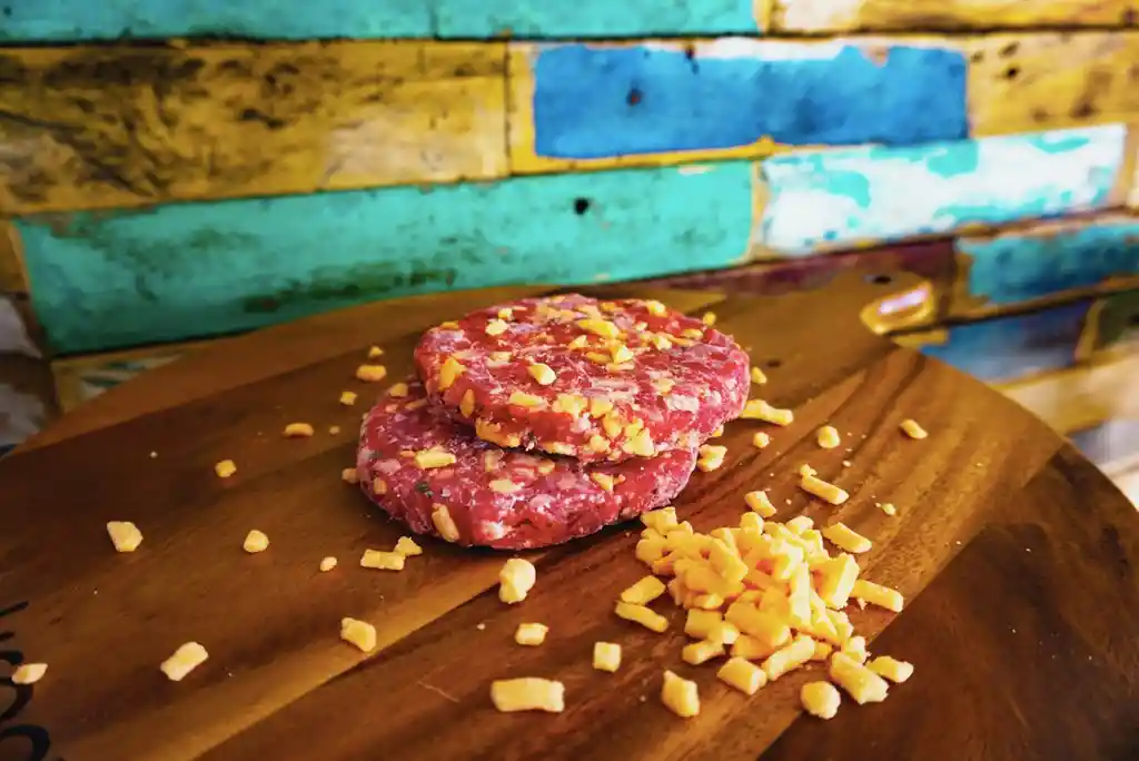 Hamburguesas de carne de vacuno importada mezclada con un exquisito queso cheddar americano granulado. 100% naturales, sin aditivos ni preservantes. Cada caja contiene 6 unidades de 125gr cada una.