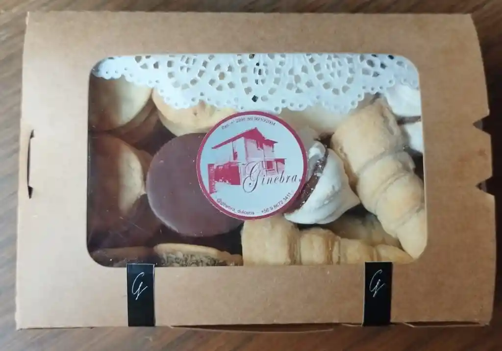 Caja de mini bocaditos dulces (20 bocaditos), estos pueden ser alfajor de maicena, alfajor de chocolate, merenguitos, cachitos, alfajor de hojarasca, brownie. Imagen referencial.