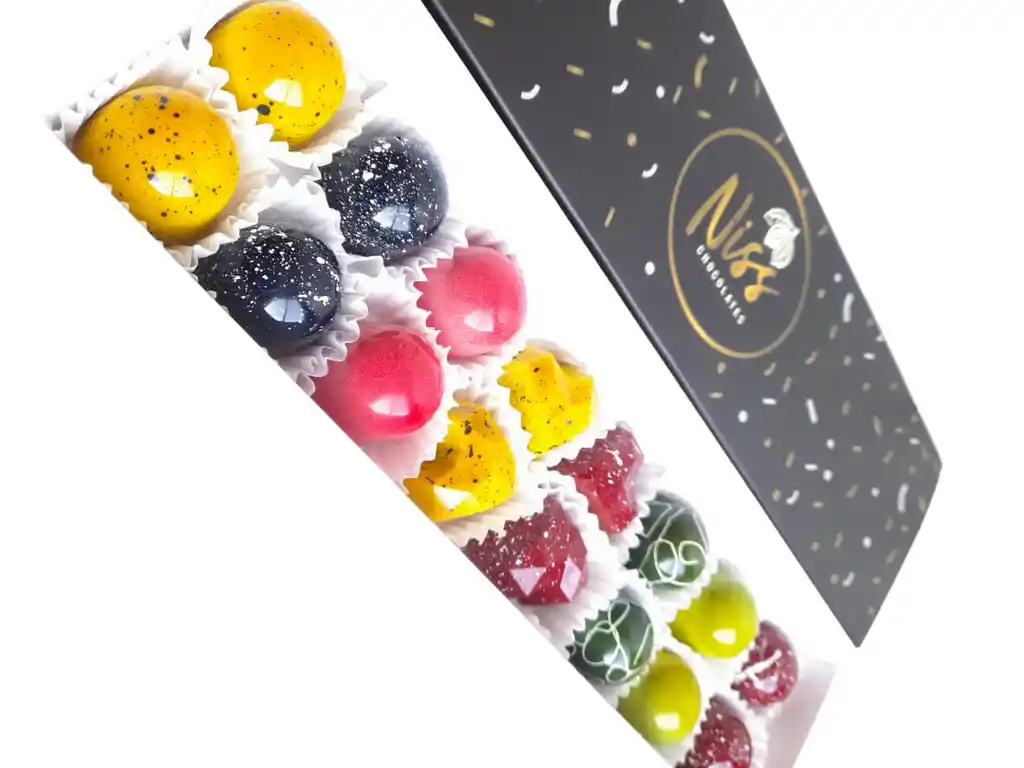 Deliciosos bombones rellenos, pintados a mano con manteca de cacao. Realizados con ingredientes seleccionados y de gran calidad. Chocolate blanco 31% de cacao, Leche 33% y negro 54% de cacao. Los sabores vienen surtidos entre: Frutos rojos, Gianduja (Avellanas Europeas con chocolate negro), Lúcuma Manjar, Maracuyá, Café Intenso, Cappuccino. *Los sabores y colores podrían variar según estacionalidad.