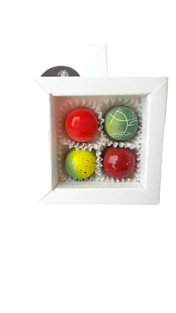 Deliciosos bombones rellenos, pintados a mano con manteca de cacao. Realizados con ingredientes seleccionados y de gran calidad. Chocolate blanco 31% de cacao, Leche 33% y negro 54% de cacao. Sabores surtidos.