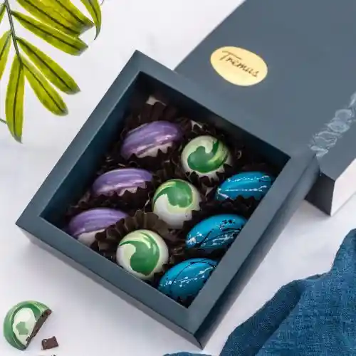 Delicados bombones rellenos, sin azúcar. Elaborados de forma artesanal, pintados a mano. Con chocolate belga 85% Cacao y colorantes naturales. Keto, bajos en carbohidratos Desde 1,4 carbohidratos neto por unidad Endulzados con Alulosa Elaborados con ingredientes de alta calidad.