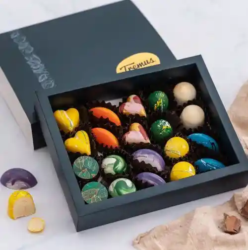 Delicados bombones rellenos, sin azúcar- Elaborados de forma artesanal, pintados a mano. Con chocolate belga, colorantes naturales y rellenos’en base a fruta fresca, liofilizada e infusiones. Contiene 20 unidades, entre nuestra línea de Frutos Secos, Frutal, y Clásica Endulzados con Alulosa Pintados a Mano Elaborados con ingredientes de alta calidad