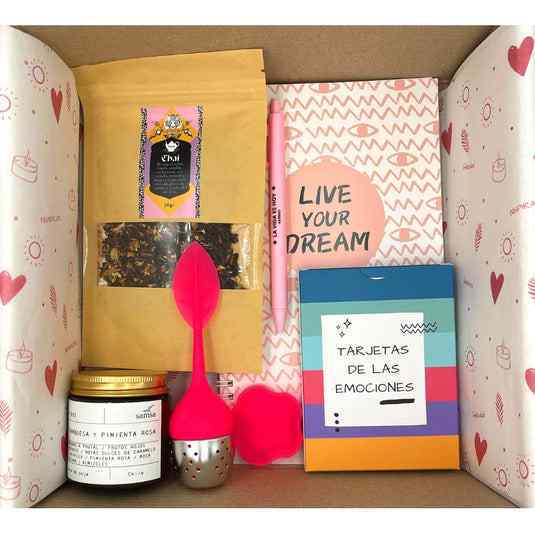 Con esta linda caja la idea es que puedas ir conociéndote cada día más y puedas ponerle nombre a lo que te pasa y sientes, a través del entendimiento de tus emociones. 🧡 💛 💚¿Qué incluye?✨Vela aromática hecha con cera de soja 100% vegetal y orgánica, de Samsa Aromas.✨Tarjetas de las emociones, set de 30 cartas, creado en conjunto con nuestra psicóloga Magdalena Mozó, donde compartimos tips, consejos y herramientas útiles para ayudarte a comprender tus emociones, entender de mejor manera lo que sientes, lidiar con tus sentimientos de forma constructiva y atraer más de aquellas emociones positivas a tu vida. ✨Exquisito Té Chai de la marca chilena Yoyo Tea.✨ Infusor para preparar el té de acero inoxidable y silicona, con platito de silicona para apoyar el infusor.✨Lindo y práctico cuaderno tapa dura y con espiral "Do What You Love"✨Lápiz con frase positiva diseño color pastel, de tinta gel negra en 0,5 mm.✨Preciosa y alegre caja reciclable y reutilizable, tamaño grande, con un lindo, colorido y original diseño. ¡Para disfrutar tu unboxing al máximo! Valor referencial productos $39.030.Un regalo / autoregalo original, lleno de detalles y emoción.💕Preparamos cada producto Karmas en un precioso packaging con cintas de colores y lleno de detalles en su interior, para sorprender a tus más queridos o a ti misma.Detalle de cada producto:a. Vela aromática hecha con cera de soja 100% vegetal, de Samsa Aromas. Hecha con productos orgánicos, reutilizables y reciclables, es biodegradable, no contamina y dura de 15 a 20 hrs. 100 gr. Variedad de Aromas exquisitos: Bergamota Sándalo, Lavanda, Vainilla o Lima.✨Tarjeta de las Emociones: set de 30 tarjetas, creado en conjunto con nuestra psicóloga Magdalena Mozó, donde compartimos tips, consejos y herramientas útiles para ayudarte a comprender tus emociones, entender de mejor manera lo que sientes, lidiar con tus sentimientos de forma constructiva y atraer más de aquellas emociones positivas a tu vida.✨Exquisito Té Chai, de la marca YoyoTea. Té negro Ceylán, piezas de canela, jengibre, cardamomo, anís estrella, pimienta blanca y negra, nuez moscada, naranja y pétalos de caléndula.El té negro es alto en teína, por lo que es un estimulante del sistema nervioso y del metabolismo. La canela, en ocasiones, ayuda a reducir la glucosa o el azúcar en la sangre y es un anticoagulante natural. El jengibre es muy efectivo para controlar gripe y resfriados y es antiinflamatorio. El cardamomo es digestivo y antiespasmódico. El anís estrella es digestivo y diurético. La pimienta acelera la digestión y permite la absorción de los beneficios de todos los componentes de la mezcla. La nuez moscada favorece el sistema cardiovascular y es antibacteriano natural y es antiinflamatorio. La naranja aporta principalmente vitaminas C y la caléndula antiséptica, antiinflamatoria y cicatrizante.Contenido 20 grs: rinde 10 tazas aprox.✨Infusor con forma de hoja de acero inoxidable y silicona, práctico y fácil de usar y de limpiar. Te ayudará a preparar y revolver tus infusiones. Con práctico "platito" de silicona para apoyar tu infusor antes o después de preparar tu té.Medida: 15 cms. ✨Cuaderno tapa dura, con precioso diseño y frase "Do what you love, Love what you do" (Haz lo que amas, Ama lo que haces) con espiral y con un práctico elástico. Características: 120 hojas rayadas; tamaño: 15,5x12 cms, ideal para llevar a todos lados contigo! Colores surtidos, todos preciosos y con la frase Do what you love. ✨Lápiz con frase positiva: diseño color pastel, de tinta gel negra en 0,5 mm. ✨Preciosa y alegre caja reciclable y reutilizable con un lindo, colorido y original diseño ¡Para disfrutar tu unboxing al máximo!