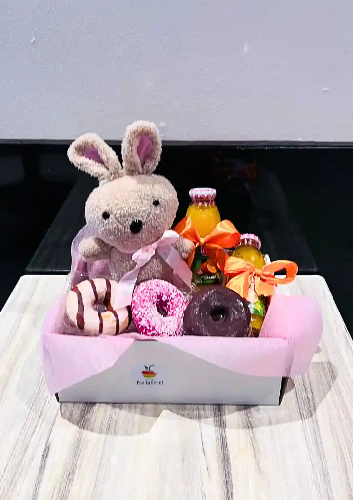 Caja compuesta de 3 Donuts, 2 Jugos y Peluche conejo ( color de peluche referencial)