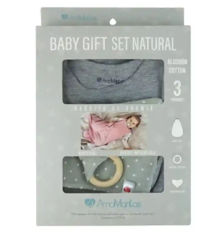 Caja de Regalo Saquito Amamantas. Esta Caja Contiene: Saquito de dormir de bebé de algodón con un cierre que lo rodea más 2 broches superiores, hasta los 12 meses. 1 Babero bandana con forro impermeable. Mordedor de suave madera natural. Fabricado en Chile.