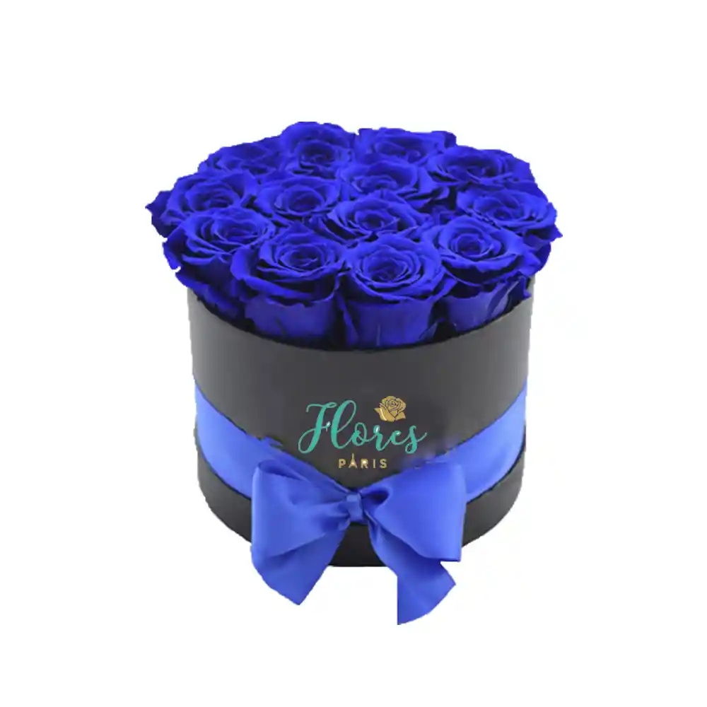 Caja cilíndrica negra de 15cm conformada por 12 rosas azules y adornada con lazo de cinta satín