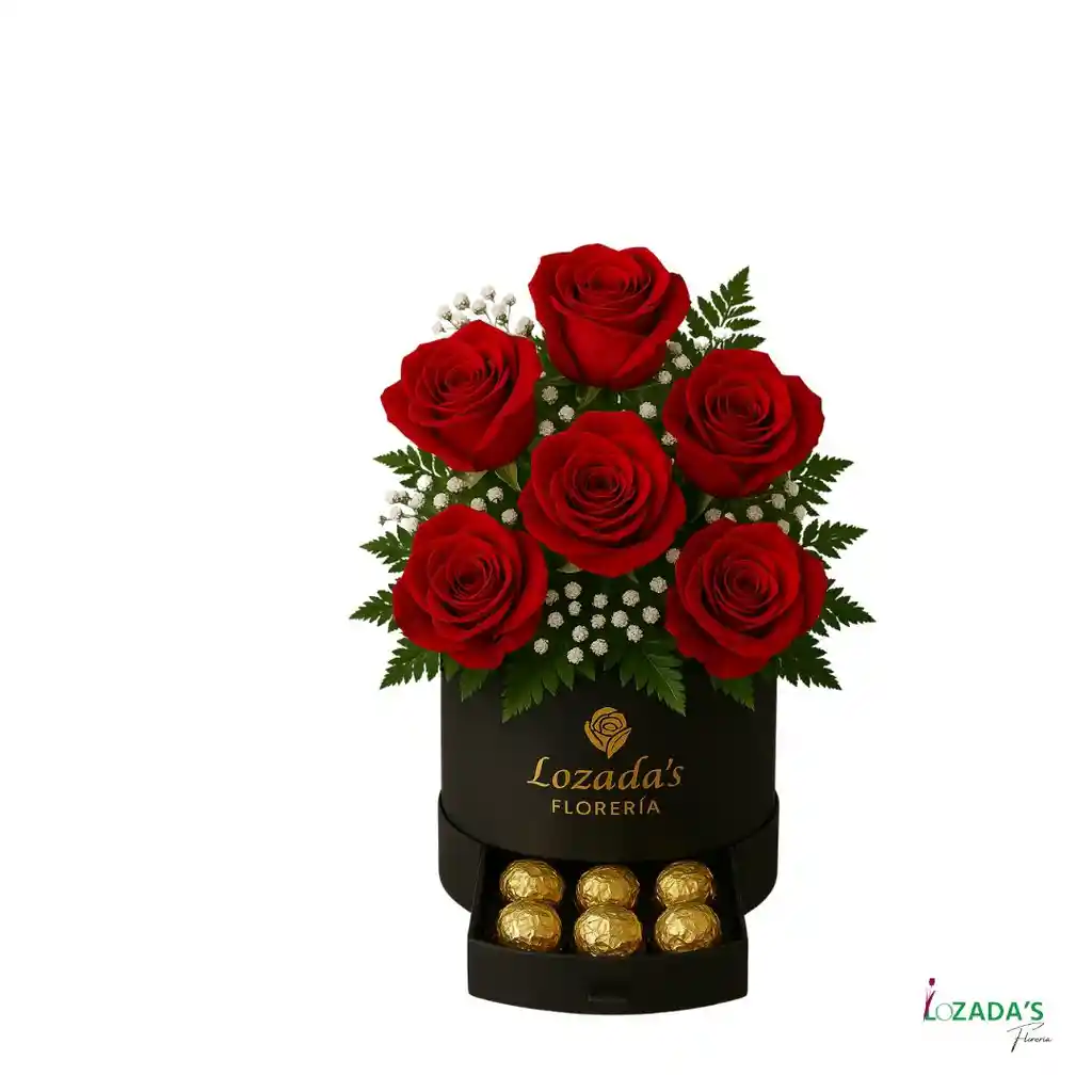 Expresa tus sentimientos más profundos con esta sofisticada caja de 10 rosas rojas, el símbolo universal del amor y la pasión. Acompañadas de delicadas flores blancas y follaje fresco, este diseño viene en una exclusiva caja negra con compartimento oculto que guarda 9 deliciosos chocolates Ferrero Rocher, listos para endulzar el momento. ❤️ Perfecto para aniversarios, San Valentín o para sorprender a esa persona especial con elegancia y dulzura.