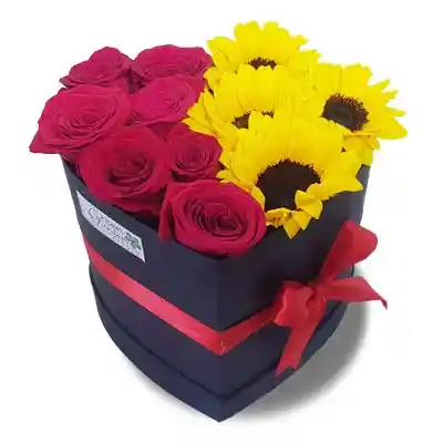 Hermoso arreglo de rosas y girasoles en caja en forma de corazón, decorada con lazo de cinta razo